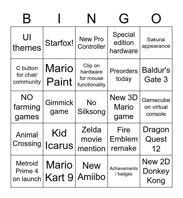 This bingo card has a free space and 24 words: Kid Icarus, Mario Kart 9, Clip on hardware for mouse functionality, Metroid Prime 4 on launch, Sakurai appearance, UI themes, C button for chat/ community, Starfox!, New 3D Mario game, Zelda movie mention, Preorders today, NO farming games, Fire Emblem remake, Dragon Quest 12, Mario Paint, Achievements / badges, Gamecube on virtual console, New Pro Controller, Baldur's Gate 3, Gimmick game, New 2D Donkey Kong, Animal Crossing, Special edition hardware and New Amiibo.