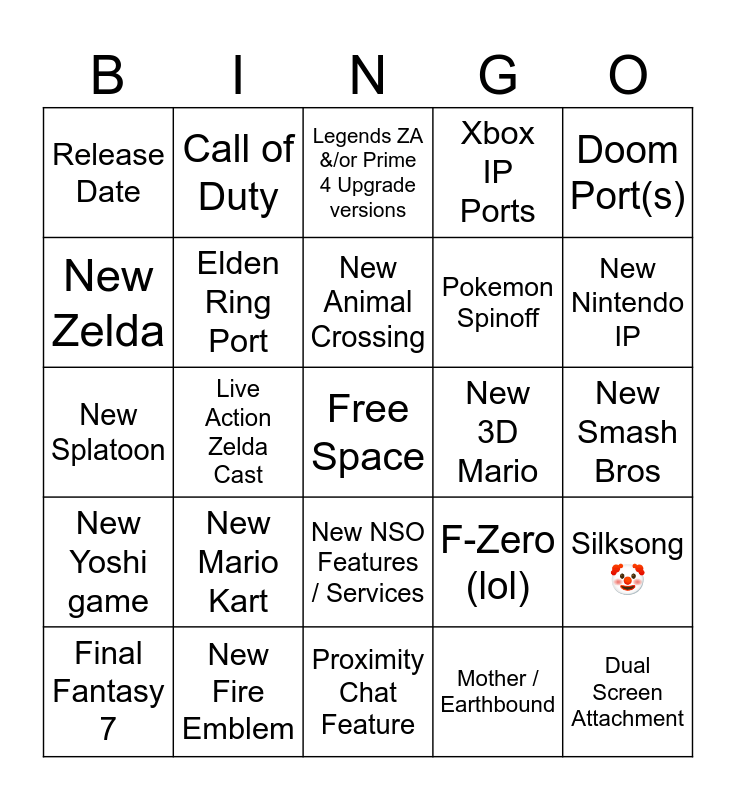 This bingo card has a free space and 24 words: New Mario Kart, New Fire Emblem, New Animal Crossing, Final Fantasy 7, Doom Port(s), Release Date, New Zelda, Call of Duty, New 3D Mario, New NSO Features / Services, Pokemon Spinoff, New Splatoon, F-Zero (lol), Silksong 🤡, Elden Ring Port, Mother / Earthbound, New Smash Bros, Legends ZA &/or Prime 4 Upgrade versions, New Nintendo IP, Live Action Zelda Cast, Dual Screen Attachment, New Yoshi game, Xbox IP Ports and Proximity Chat Feature.