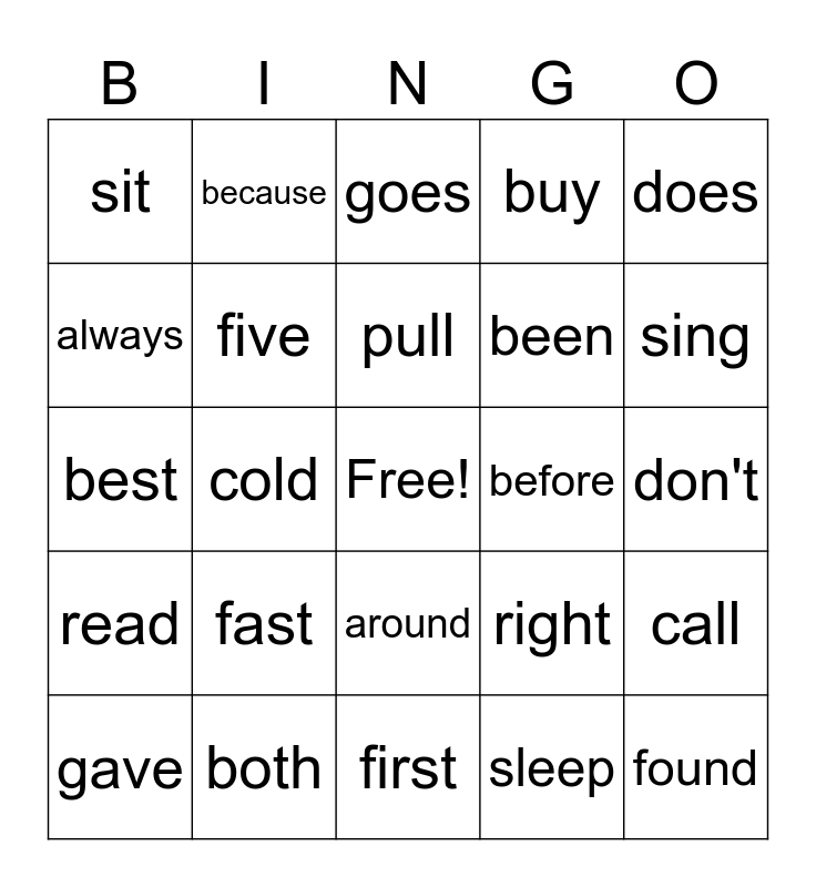 This bingo card has a free space and 24 words: fast, both, pull, gave, does, sit, always, because, before, around, been, best, right, call, five, sleep, don't, goes, sing, cold, found, read, buy and first.