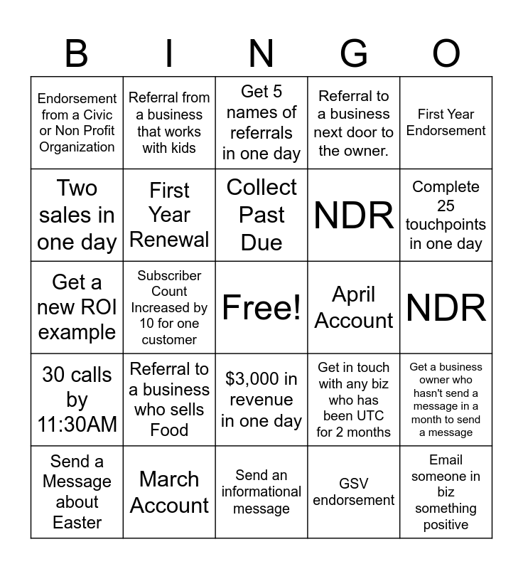 This bingo card has a free space and 24 words: Referral to a business who sells Food, March Account, Collect Past Due, Send a Message about Easter, First Year Endorsement, Endorsement from a Civic or Non Profit Organization, Two sales in one day, Referral from a business that works with kids, April Account, $3,000 in revenue in one day, NDR, Get a new ROI example, Get in touch with any biz who has been UTC for 2 months, Get a business owner who hasn't send a message in a month to send a message, First Year Renewal, GSV endorsement, NDR, Get 5 names of referrals in one day, Complete 25 touchpoints in one day, Subscriber Count Increased by 10 for one customer, Email someone in biz something positive, 30 calls by 11:30AM, Referral to a business next door to the owner. and Send an informational message.