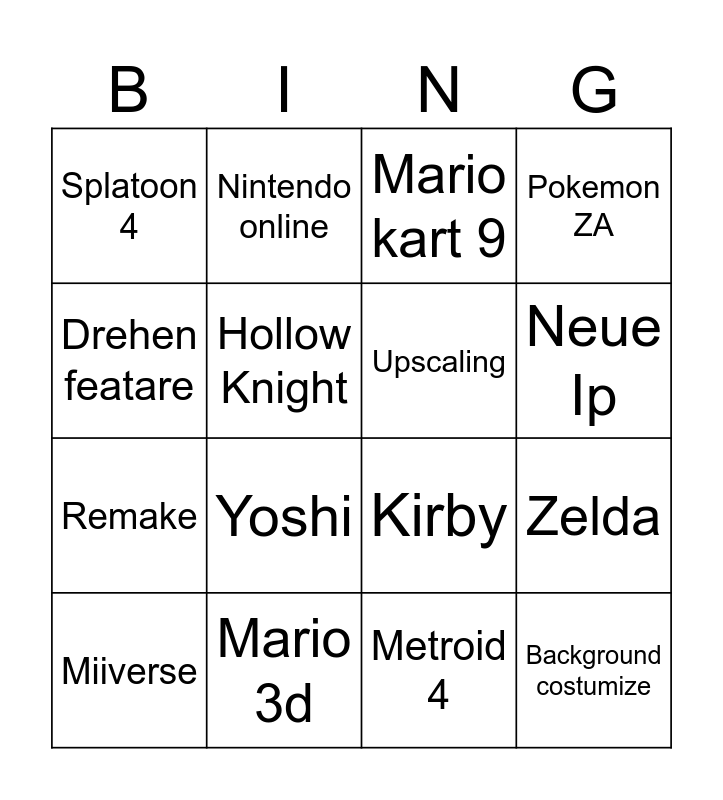 This bingo card has 16 words: Mario 3d, Zelda, Mario kart 9, Splatoon 4, Remake, Nintendo online, Kirby, Metroid 4, Drehen featare, Hollow Knight, Miiverse, Pokemon ZA, Yoshi, Neue Ip, Upscaling and Background costumize.