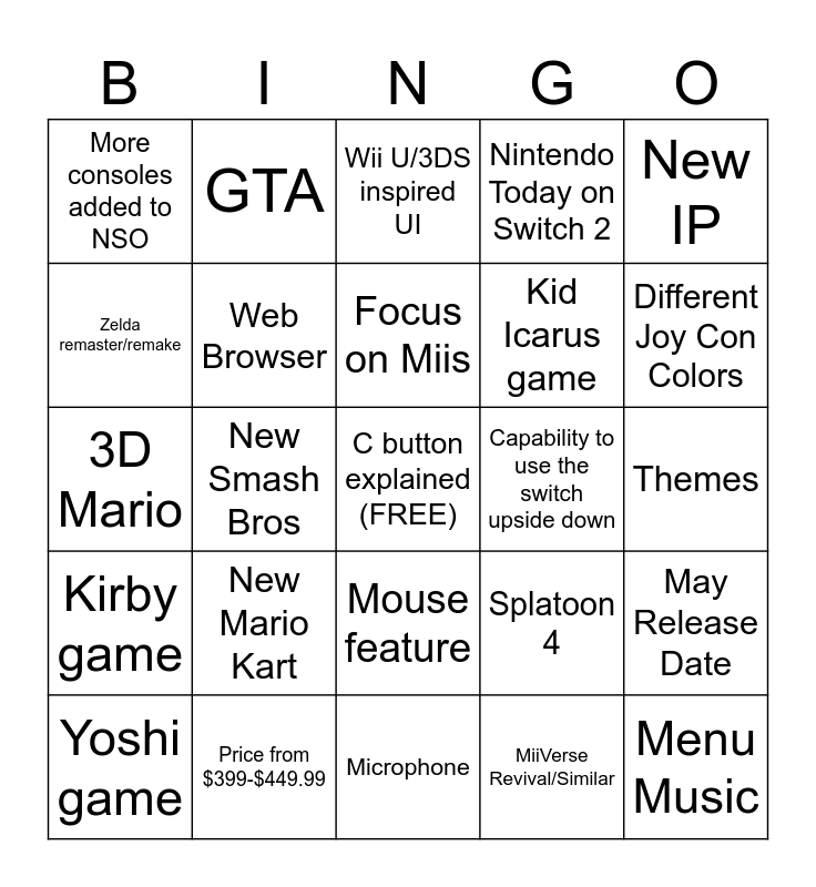This bingo card has a free space and 24 words: New Mario Kart, Price from $399-$449.99, Focus on Miis, Yoshi game, New IP, More consoles added to NSO, Zelda remaster/remake, GTA, Capability to use the switch upside down, Mouse feature, Kid Icarus game, 3D Mario, Splatoon 4, May Release Date, Web Browser, MiiVerse Revival/Similar, Themes, Wii U/3DS inspired UI, Different Joy Con Colors, New Smash Bros, Menu Music, Kirby game, Nintendo Today on Switch 2 and Microphone.