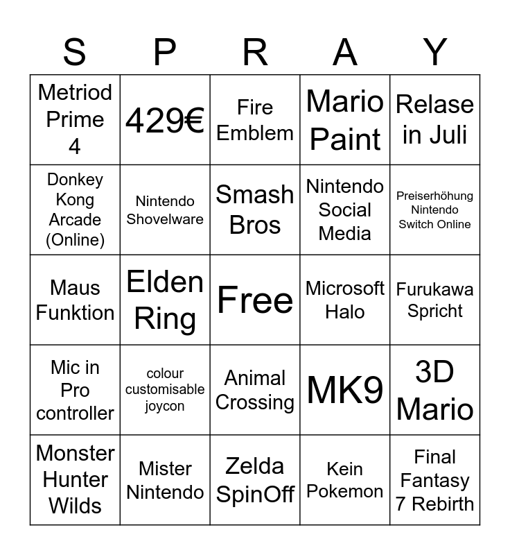 This bingo card has a free space and 24 words: colour customisable joycon, Mister Nintendo, Smash Bros, Monster Hunter Wilds, Relase in Juli, Metriod Prime 4, Donkey Kong Arcade (Online), 429€, Microsoft Halo, Animal Crossing, Nintendo Social Media, Maus Funktion, MK9, 3D Mario, Nintendo Shovelware, Kein Pokemon, Furukawa Spricht, Fire Emblem, Preiserhöhung Nintendo Switch Online, Elden Ring, Final Fantasy 7 Rebirth, Mic in Pro controller, Mario Paint and Zelda SpinOff.