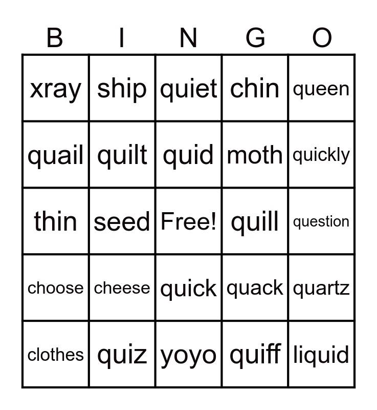 This bingo card has a free space and 24 words: cheese, quiz, quid, clothes, queen, xray, quail, ship, quill, quick, moth, thin, quack, quartz, quilt, quiff, question, quiet, quickly, seed, liquid, choose, chin and yoyo.