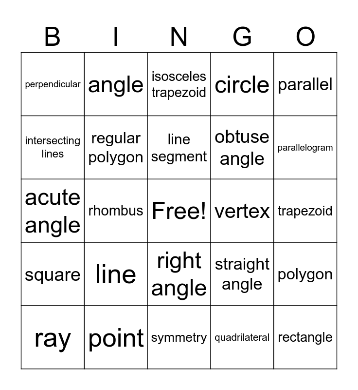 This bingo card has a free space and 24 words: line, point, line segment, ray, parallel, perpendicular, intersecting lines, angle, vertex, right angle, obtuse angle, acute angle, straight angle, polygon, regular polygon, quadrilateral, trapezoid, isosceles trapezoid, parallelogram, rhombus, rectangle, square, circle and symmetry.