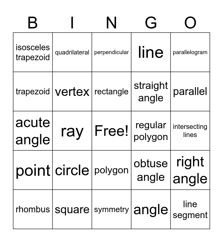 This bingo card has a free space and 24 words: circle, square, rectangle, rhombus, parallelogram, isosceles trapezoid, trapezoid, quadrilateral, regular polygon, polygon, straight angle, acute angle, obtuse angle, right angle, vertex, angle, intersecting lines, perpendicular, parallel, ray, line segment, point, line and symmetry.