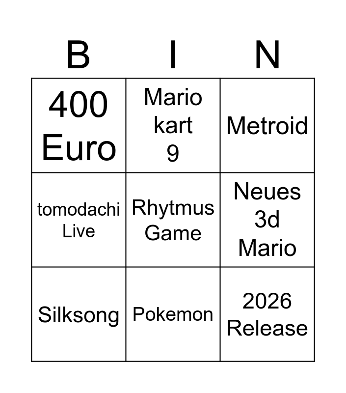 This bingo card has a free space and 8 words: Neues 3d Mario, Metroid, Mario kart 9, Silksong, 400 Euro, 2026 Release, tomodachi Live and Pokemon.