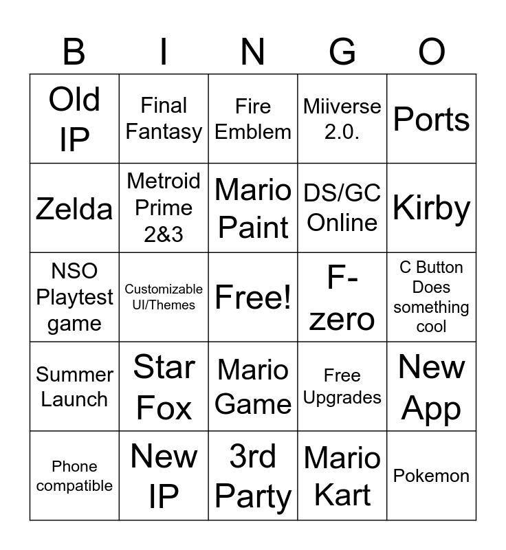 This bingo card has a free space and 26 words: Mario Game, Mario Kart, Mario Paint, New IP, Ports, Old IP, Zelda, Final Fantasy, C Button Does something cool, Free Upgrades, DS/GC Online, NSO Playtest game, New App, Phone compatible, Customizable UI/Themes, $350-$400 Price, Miiverse 2.0., Summer Launch, Fire Emblem, Pokemon, Kirby, 3rd Party, F-zero, Star Fox, Metroid Prime 2&3 and Animal Crossing.