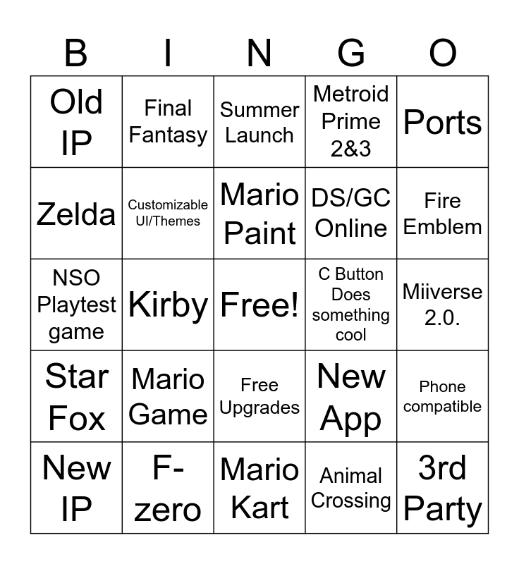 This bingo card has a free space and 25 words: Mario Game, Mario Kart, Mario Paint, New IP, Ports, Old IP, Zelda, Final Fantasy, C Button Does something cool, Free Upgrades, DS/GC Online, NSO Playtest game, New App, Phone compatible, Customizable UI/Themes, $350-$400 Price, Miiverse 2.0., Summer Launch, Fire Emblem, Kirby, 3rd Party, F-zero, Star Fox, Metroid Prime 2&3 and Animal Crossing.