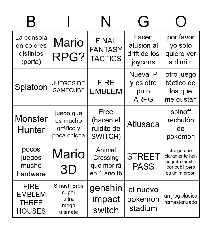 This bingo card has a free space and 24 words: Mario 3D, Smash Bros super ultra mega ultimate, FIRE EMBLEM, FIRE EMBLEM THREE HOUSES, por favor yo solo quiero ver a dimitri, La consola en colores distintos (porfa), Splatoon, Mario RPG?, Atlusada, Animal Crossing que morirá en 1 año tb, Nueva IP y es otro puto ARPG, Monster Hunter, STREET PASS, Juego que claramente han pagado mucho por publi pero es un mierdón, JUEGOS DE GAMECUBE, el nuevo pokemon stadium, spinoff rechulón de pokemon, FINAL FANTASY TACTICS, otro juego táctico de los que me gustan, juego que es mucho gráfico y poca chicha, un jrpg clásico remasterizado, pocos juegos mucho hardware, hacen alusión al drift de los joycons and genshin impact switch.