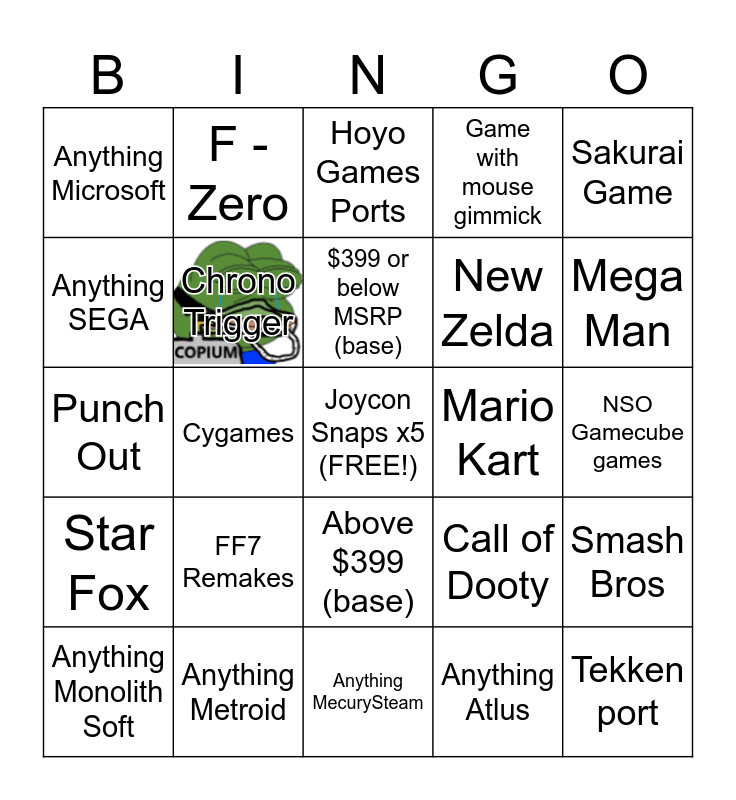 This bingo card has 1 images, a free space and 28 words: Smash Bros, New 2D/3D Mario, New Zelda, Anything Atlus, Anything SEGA, Hoyo Games Ports, F - Zero, Star Fox, Mario Kart, Anything Monolith Soft, Punch Out, Game with mouse gimmick, Anything Metroid, Anything MecurySteam, Mega Man, Anything Square Enix, FF7 Remakes, Chrono Trigger, $399 or below MSRP (base), Above $399 (base), Anything Microsoft, Street Fighter port, Tekken port, Cygames, NSO Gamecube games, Call of Dooty, Sakurai Game and Capcom Presents.