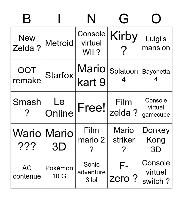 This bingo card has a free space and 24 words: Mario 3D, Pokémon 10 G, Mario kart 9, AC contenue, Luigi's mansion, New Zelda ?, OOT remake, Metroid, Film zelda ?, Film mario 2 ?, Splatoon 4, Smash ?, Mario striker ?, Donkey Kong 3D, Starfox, F-zero ?, Console virtuel gamecube, Console virtuel WII ?, Bayonetta 4, Le Online, Console virtuel switch ?, Wario ???, Kirby ? and Sonic adventure 3 lol.