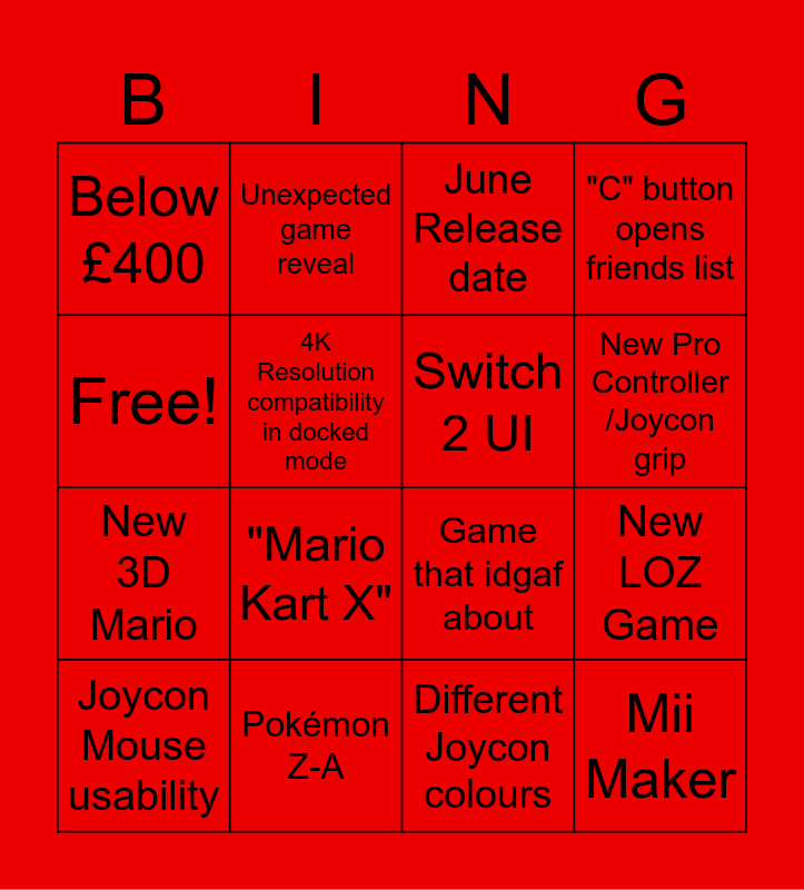This bingo card has 16 words: Pokémon Z-A, New LOZ Game, June Release date, Below £400, New 3D Mario, Unexpected game reveal, Game that idgaf about, Different Joycon colours, Free!, 4K Resolution compatibility in docked mode, Joycon Mouse usability, "C" button opens friends list, "Mario Kart X", New Pro Controller /Joycon grip, Switch 2 UI and Mii Maker.