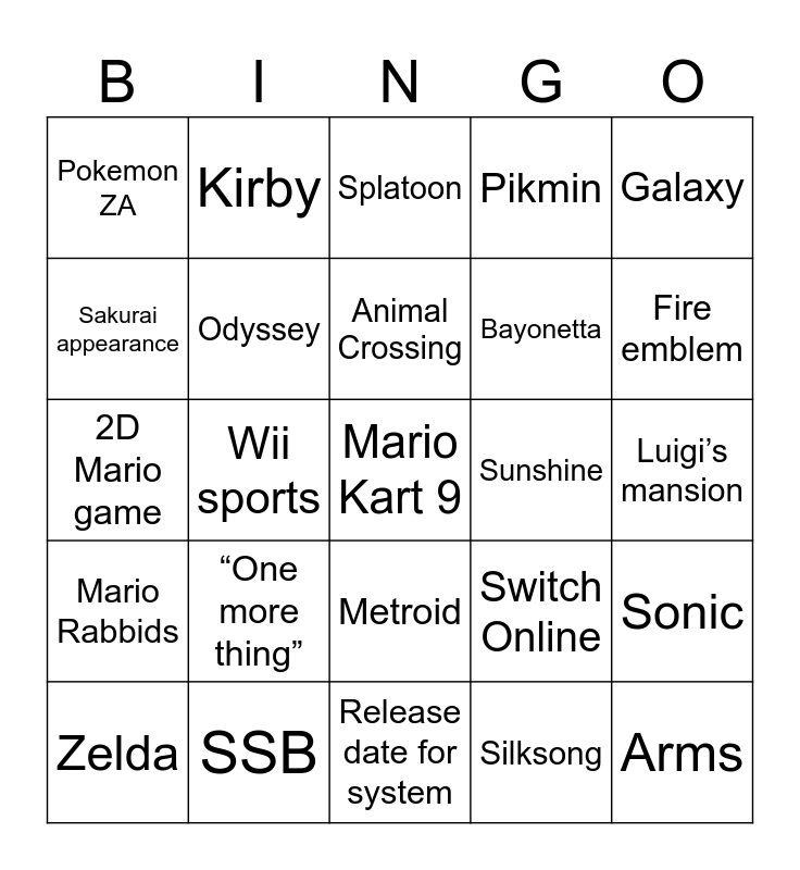 This bingo card has a free space and 24 words: “One more thing”, SSB, Animal Crossing, Zelda, Galaxy, Pokemon ZA, Sakurai appearance, Kirby, Sunshine, Metroid, Bayonetta, 2D Mario game, Switch Online, Sonic, Odyssey, Silksong, Luigi’s mansion, Splatoon, Fire emblem, Wii sports, Arms, Mario Rabbids, Pikmin and Release date for system.