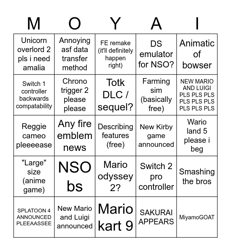 This bingo card has a free space and 24 words: NSO bs, New Mario and Luigi announced, Totk DLC / sequel?, SPLATOON 4 ANNOUNCED PLEEAASSEE, Animatic of bowser, Unicorn overlord 2 pls i need amalia, Switch 1 controller backwards compatability, Annoying asf data transfer method, New Kirby game announced, Mario odyssey 2?, Farming sim (basically free), Reggie cameo pleeeease, Switch 2 pro controller, Smashing the bros, Chrono trigger 2 please please, SAKURAI APPEARS, Wario land 5 please i beg, FE remake (it'll definitely happen right), NEW MARIO AND LUIGI PLS PLS PLS PLS PLS PLS PLS PLS PLS, Any fire emblem news, MiyamoGOAT, "Large" size (anime game), DS emulator for NSO? and Mario kart 9.