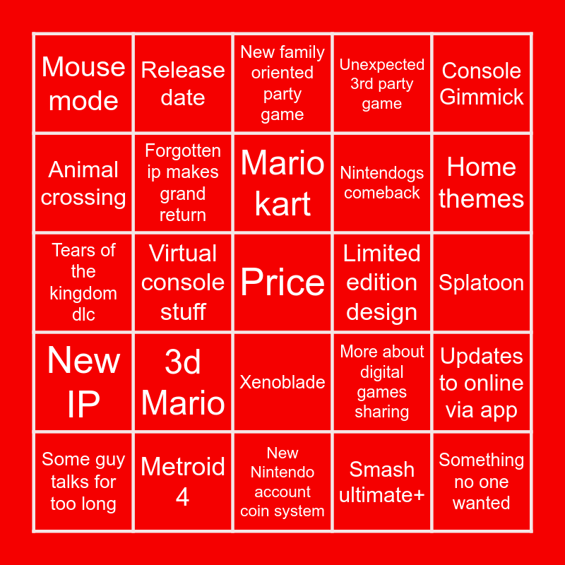 This bingo card has a free space and 24 words: 3d Mario, Metroid 4, Mario kart, Some guy talks for too long, Console Gimmick, Mouse mode, Animal crossing, Release date, Limited edition design, Xenoblade, Nintendogs comeback, Tears of the kingdom dlc, More about digital games sharing, Updates to online via app, Forgotten ip makes grand return, Smash ultimate+, Splatoon, New family oriented party game, Home themes, Virtual console stuff, Something no one wanted, New IP, Unexpected 3rd party game and New Nintendo account coin system.