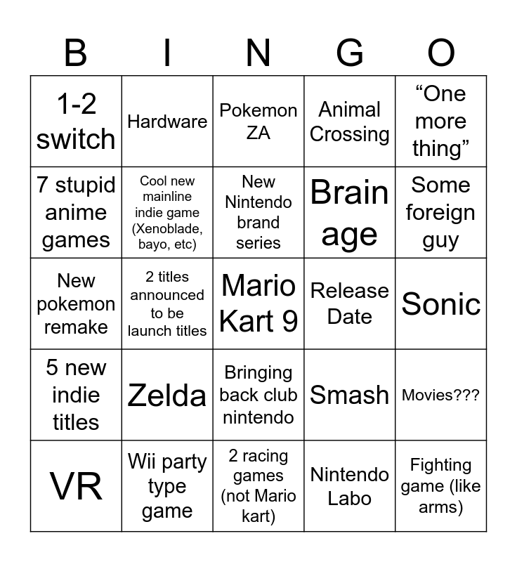 This bingo card has a free space and 24 words: Zelda, Wii party type game, New Nintendo brand series, VR, “One more thing”, 1-2 switch, 7 stupid anime games, Hardware, Release Date, Bringing back club nintendo, Brain age, New pokemon remake, Smash, Movies???, Cool new mainline indie game (Xenoblade, bayo, etc), Nintendo Labo, Sonic, Pokemon ZA, Some foreign guy, 2 titles announced to be launch titles, Fighting game (like arms), 5 new indie titles, Animal Crossing and 2 racing games (not Mario kart).