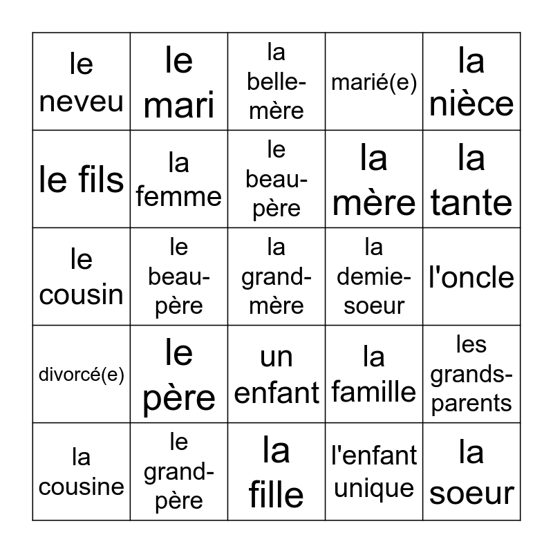 This bingo card has 25 words: le père, la fille, le beau-père, la cousine, la nièce, le neveu, le fils, le mari, la demie-soeur, un enfant, la mère, le cousin, la famille, les grands-parents, la femme, la soeur, l'oncle, la belle-mère, la tante, le beau-père, la grand-mère, le grand-père, divorcé(e), marié(e) and l'enfant unique.