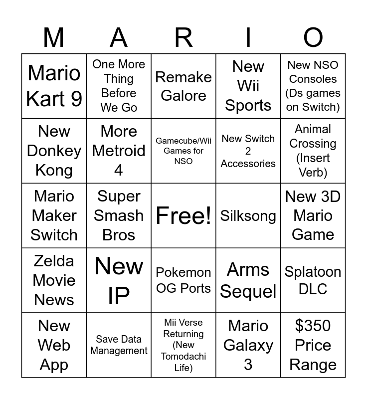 This bingo card has a free space and 24 words: New IP, Save Data Management, Gamecube/Wii Games for NSO, New Web App, New NSO Consoles (Ds games on Switch), Mario Kart 9, New Donkey Kong, One More Thing Before We Go, Silksong, Pokemon OG Ports, New Switch 2 Accessories, Mario Maker Switch, Arms Sequel, Splatoon DLC, More Metroid 4, Mario Galaxy 3, New 3D Mario Game, Remake Galore, Animal Crossing (Insert Verb), Super Smash Bros, $350 Price Range, Zelda Movie News, New Wii Sports and Mii Verse Returning (New Tomodachi Life).
