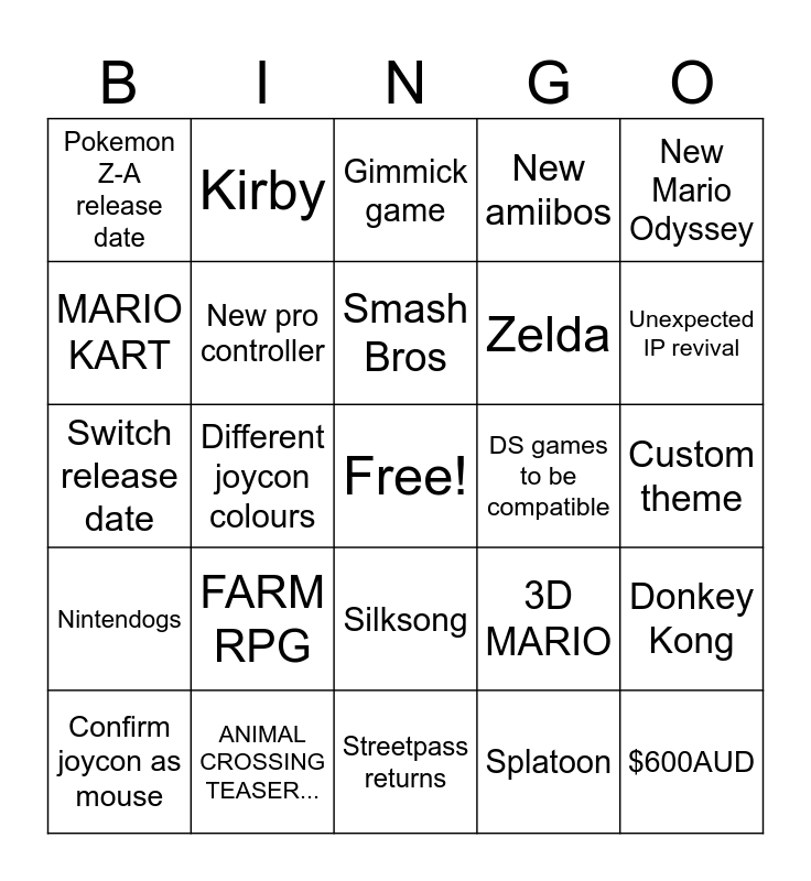 This bingo card has a free space and 24 words: FARM RPG, ANIMAL CROSSING TEASER..., Smash Bros, Confirm joycon as mouse, New Mario Odyssey, Pokemon Z-A release date, MARIO KART, Kirby, DS games to be compatible, Silksong, Zelda, Switch release date, 3D MARIO, Donkey Kong, New pro controller, Splatoon, Custom theme, Gimmick game, Unexpected IP revival, Different joycon colours, $600AUD, Nintendogs, New amiibos and Streetpass returns.
