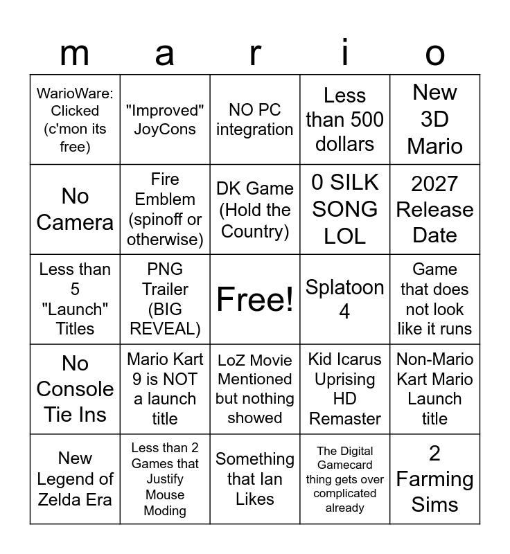 This bingo card has a free space and 24 words: Mario Kart 9 is NOT a launch title, Less than 2 Games that Justify Mouse Moding, DK Game (Hold the Country), New Legend of Zelda Era, New 3D Mario, WarioWare: Clicked (c'mon its free), No Camera, "Improved" JoyCons, Splatoon 4, LoZ Movie Mentioned but nothing showed, 0 SILK SONG LOL, Less than 5 "Launch" Titles, Kid Icarus Uprising HD Remaster, Non-Mario Kart Mario Launch title, Fire Emblem (spinoff or otherwise), The Digital Gamecard thing gets over complicated already, Game that does not look like it runs, NO PC integration, 2027 Release Date, PNG Trailer (BIG REVEAL), 2 Farming Sims, No Console Tie Ins, Less than 500 dollars and Something that Ian Likes.