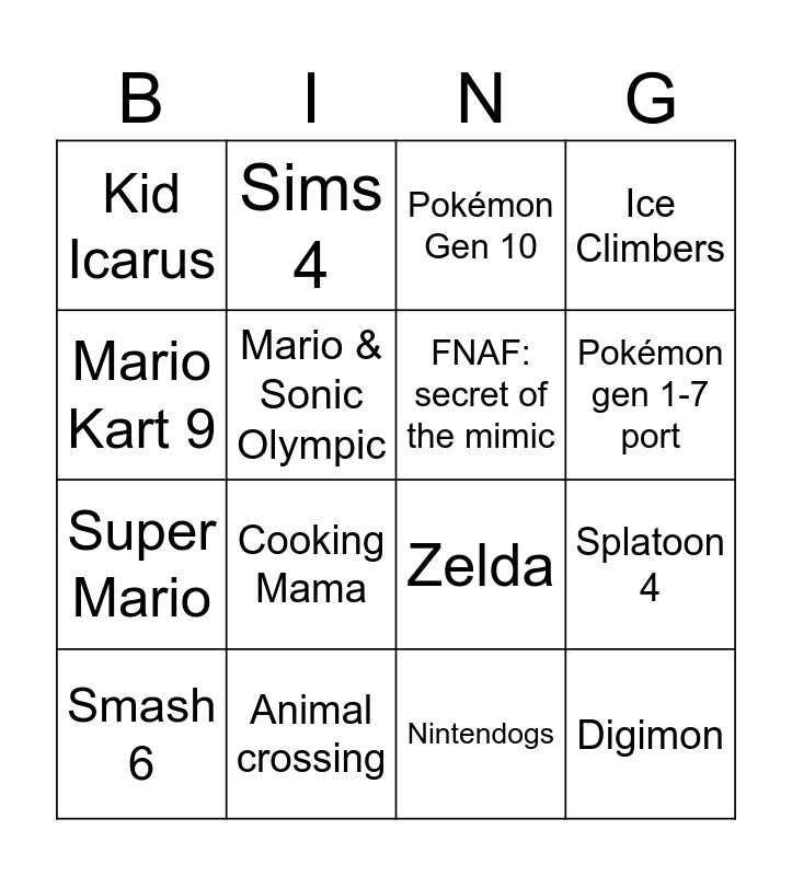 This bingo card has 16 words: Animal crossing, Splatoon 4, Pokémon Gen 10, Kid Icarus, Super Mario, Sims 4, Zelda, Nintendogs, Mario Kart 9, Mario & Sonic Olympic, Smash 6, Ice Climbers, Cooking Mama, Pokémon gen 1-7 port, FNAF: secret of the mimic and Digimon.