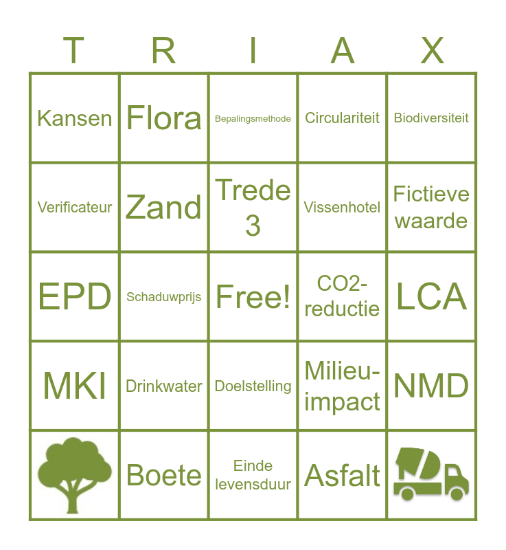 This bingo card has 5 images, a free space and 40 words: Asfalt, Bepalingsmethode, Beton, Biodiversiteit, Boete, Circulariteit, CO2-reductie, Doelstelling, Drinkwater, Ecopassage, Einde levensduur, EMVI-korting, EPD, Fauna, Fictieve waarde, Flora, Grondstoffen, HVO, Kansen, Klimaatverandering, LCA, Levensduur, Maatregelen, Milieu-impact, MKI, Natuurbewust, NMD, Primair, Productiefase, Risico, Schaduwprijs, Secundair, Sloop, Staal, Trede 3, Verificateur, Vissenhotel, VTW, Zand and Zero Emissie.