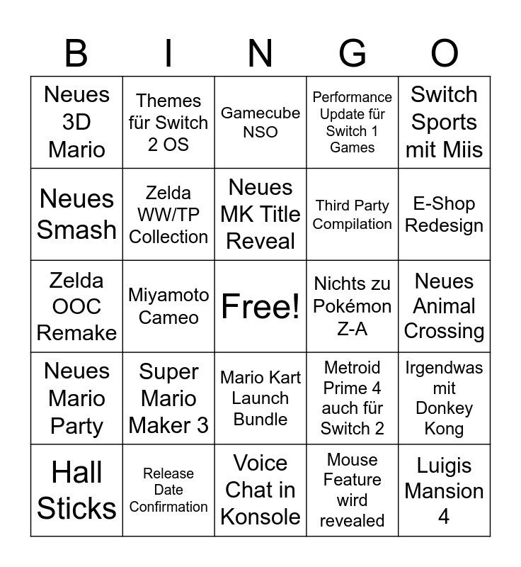This bingo card has a free space and 24 words: Super Mario Maker 3, Release Date Confirmation, Neues MK Title Reveal, Hall Sticks, Switch Sports mit Miis, Neues 3D Mario, Neues Smash, Themes für Switch 2 OS, Nichts zu Pokémon Z-A, Mario Kart Launch Bundle, Third Party Compilation, Zelda OOC Remake, Metroid Prime 4 auch für Switch 2, Irgendwas mit Donkey Kong, Zelda WW/TP Collection, Mouse Feature wird revealed, Neues Animal Crossing, Gamecube NSO, E-Shop Redesign, Miyamoto Cameo, Luigis Mansion 4, Neues Mario Party, Performance Update für Switch 1 Games and Voice Chat in Konsole.