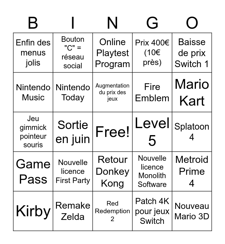 This bingo card has a free space and 24 words: Nouvelle licence First Party, Remake Zelda, Augmentation du prix des jeux, Kirby, Baisse de prix Switch 1, Enfin des menus jolis, Nintendo Music, Bouton "C" = réseau social, Level 5, Retour Donkey Kong, Fire Emblem, Jeu gimmick pointeur souris, Nouvelle licence Monolith Software, Metroid Prime 4, Nintendo Today, Patch 4K pour jeux Switch, Splatoon 4, Online Playtest Program, Mario Kart, Sortie en juin, Nouveau Mario 3D, Game Pass, Prix 400€ (10€ près) and Red Redemption 2.