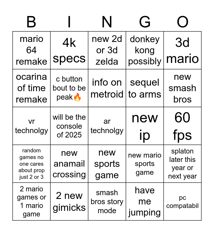 This bingo card has a free space and 24 words: new anamail crossing, 2 new gimicks, info on metroid, 2 mario games or 1 mario game, 3d mario, mario 64 remake, ocarina of time remake, 4k specs, new ip, new sports game, sequel to arms, vr technolgy, new mario sports game, splaton later this year or next year, c button bout to be peak🔥, have me jumping, 60 fps, new 2d or 3d zelda, new smash bros, will be the console of 2025, pc compatabil, random games no one cares about prop just 2 or 3, donkey kong possibly and smash bros story mode.