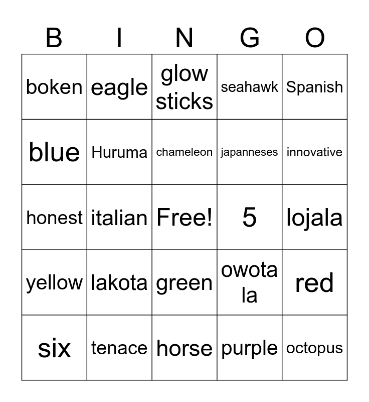 This bingo card has a free space and 24 words: lakota, tenace, chameleon, six, Spanish, boken, blue, eagle, 5, green, japanneses, honest, owota la, red, Huruma, purple, lojala, glow sticks, innovative, italian, octopus, yellow, seahawk and horse.