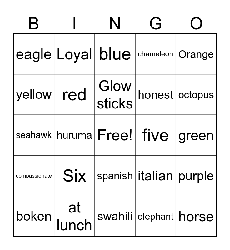 This bingo card has a free space and 24 words: Six, at lunch, Glow sticks, boken, Orange, eagle, yellow, Loyal, five, spanish, honest, seahawk, italian, purple, red, elephant, green, blue, octopus, huruma, horse, compassionate, chameleon and swahili.