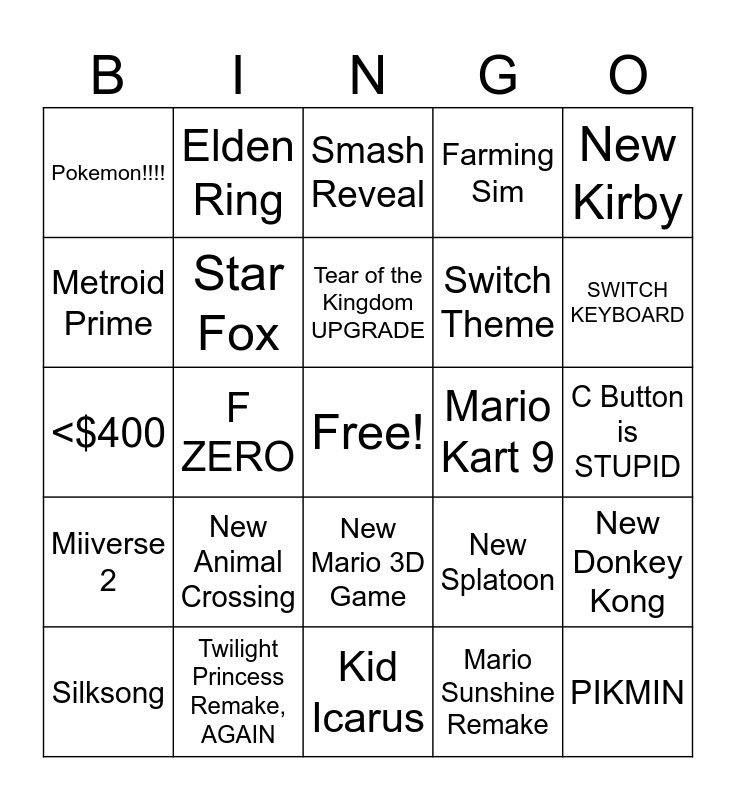 This bingo card has a free space and 24 words: New Animal Crossing, Twilight Princess Remake, AGAIN, Tear of the Kingdom UPGRADE, Silksong, New Kirby, Pokemon!!!!, Metroid Prime, Elden Ring, Mario Kart 9, New Mario 3D Game, Switch Theme, <$400, New Splatoon, New Donkey Kong, Star Fox, Mario Sunshine Remake, C Button is STUPID, Smash Reveal, SWITCH KEYBOARD, F ZERO, PIKMIN, Miiverse 2, Farming Sim and Kid Icarus.
