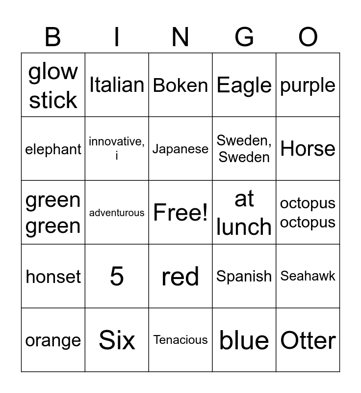 This bingo card has a free space and 24 words: 5, Six, Japanese, orange, purple, glow stick, elephant, Italian, at lunch, red, Sweden, Sweden, green green, Spanish, Seahawk, innovative, i, blue, octopus octopus, Boken, Horse, adventurous, Otter, honset, Eagle and Tenacious.