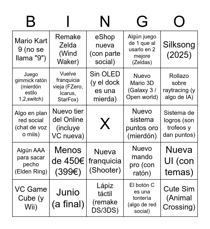 This bingo card has a free space and 24 words: Menos de 450€ (399€), Junio (a final), Sin OLED (y el dock es una mierda), VC Game Cube (y Wii), Silksong (2025), Mario Kart 9 (no se llama "9"), Juego gimmick ratón (mierdón estilo 1,2,switch), Remake Zelda (Wind Waker), Nuevo sistema puntos oro (mierdón), Nueva franquicia (Shooter), Nuevo Mario 3D (Galaxy 3 / Open world), Algo en plan red social (chat de voz o miis), Nuevo mando pro (con ratón), Nueva UI (con temas), Vuelve franquicia vieja (FZero, Icarus, StarFox), El botón C es una tontería (algo de red social), Sistema de logros (son trofeos y dan puntos), eShop nueva (con parte social), Rollazo sobre raytracing (y algo de IA), Nuevo tier del Online (incluye VC nueva), Cute Sim (Animal Crossing), Algún AAA para sacar pecho (Elden Ring), Algún juego de 1 que al usarlo en 2 mejore (Zeldas) and Lápiz táctil (remake DS/3DS).