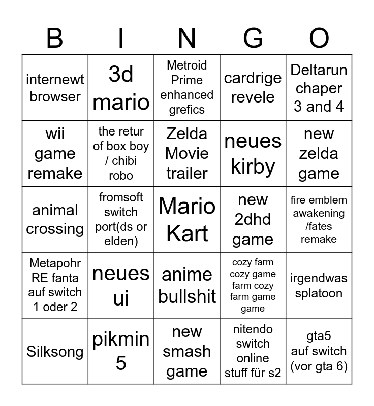 This bingo card has a free space and 24 words: neues ui, pikmin 5, Zelda Movie trailer, Silksong, Deltarun chaper 3 and 4, internewt browser, wii game remake, 3d mario, new 2dhd game, anime bullshit, neues kirby, animal crossing, cozy farm cozy game farm cozy farm game game, irgendwas splatoon, the retur of box boy / chibi robo, nitendo switch online stuff für s2, fire emblem awakening /fates remake, Metroid Prime enhanced grefics, new zelda game, fromsoft switch port(ds or elden), gta5 auf switch (vor gta 6), Metapohr RE fanta auf switch 1 oder 2, cardrige revele and new smash game.
