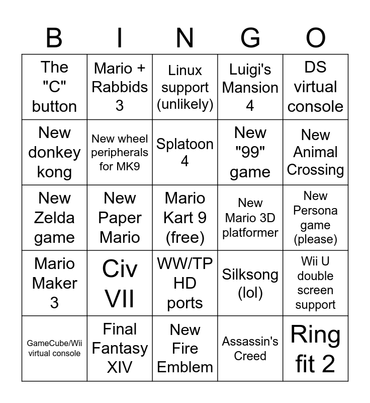 This bingo card has a free space and 24 words: Civ VII, Final Fantasy XIV, Splatoon 4, GameCube/Wii virtual console, DS virtual console, The "C" button, New donkey kong, Mario + Rabbids 3, New Mario 3D platformer, WW/TP HD ports, New "99" game, New Zelda game, Silksong (lol), Wii U double screen support, New wheel peripherals for MK9, Assassin's Creed, New Persona game (please), Linux support (unlikely), New Animal Crossing, New Paper Mario, Ring fit 2, Mario Maker 3, Luigi's Mansion 4 and New Fire Emblem.