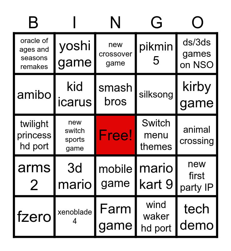 This bingo card has a free space and 24 words: fzero, 3d mario, smash bros, wind waker hd port, ds/3ds games on NSO, oracle of ages and seasons remakes, yoshi game, new crossover game, Switch menu themes, animal crossing, twilight princess hd port, kid icarus, mario kart 9, new first party IP, amibo, xenoblade 4, Farm game, pikmin 5, kirby game, arms 2, new switch sports game, mobile game, silksong and tech demo.