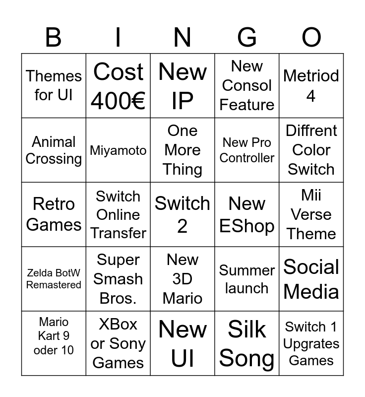 This bingo card has a free space and 24 words: Super Smash Bros., XBox or Sony Games, One More Thing, Mario Kart 9 oder 10, Metriod 4, Themes for UI, Animal Crossing, Cost 400€, New EShop, New 3D Mario, New Pro Controller, Retro Games, Summer launch, Social Media, Miyamoto, Silk Song, Mii Verse Theme, New IP, Diffrent Color Switch, Switch Online Transfer, Switch 1 Upgrates Games, Zelda BotW Remastered, New Consol Feature and New UI.