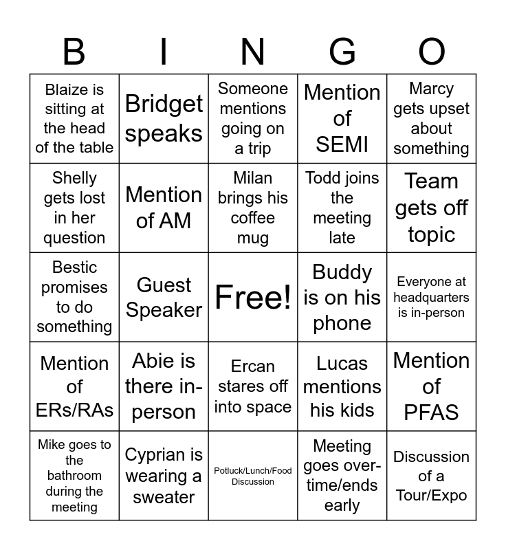This bingo card has a free space and 24 words: Abie is there in-person, Cyprian is wearing a sweater, Milan brings his coffee mug, Mike goes to the bathroom during the meeting, Marcy gets upset about something, Blaize is sitting at the head of the table, Shelly gets lost in her question, Bridget speaks, Buddy is on his phone, Ercan stares off into space, Todd joins the meeting late, Bestic promises to do something, Lucas mentions his kids, Mention of PFAS, Mention of AM, Meeting goes over-time/ends early, Everyone at headquarters is in-person, Someone mentions going on a trip, Team gets off topic, Guest Speaker, Discussion of a Tour/Expo, Mention of ERs/RAs, Mention of SEMI and Potluck/Lunch/Food Discussion.