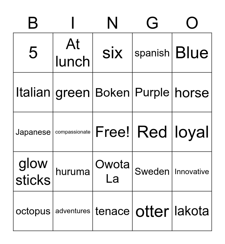 This bingo card has a free space and 24 words: huruma, adventures, Boken, octopus, Blue, 5, Italian, At lunch, Red, Owota La, Purple, Japanese, Sweden, Innovative, green, otter, loyal, six, horse, compassionate, lakota, glow sticks, spanish and tenace.