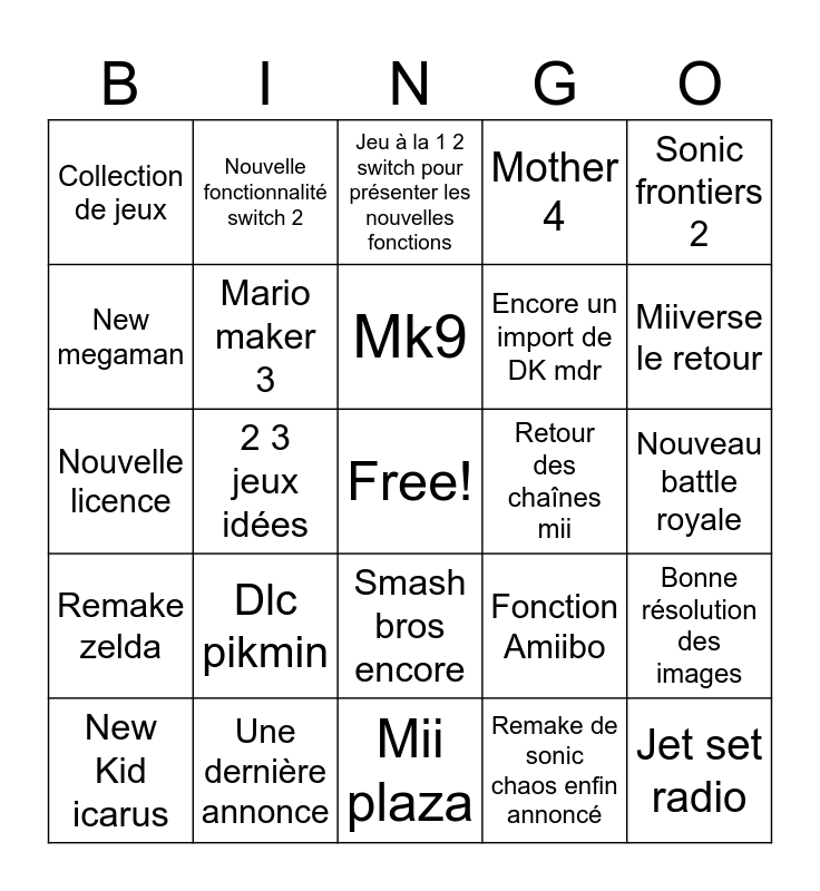 This bingo card has a free space and 24 words: Dlc pikmin, Une dernière annonce, Mk9, New Kid icarus, Sonic frontiers 2, Collection de jeux, New megaman, Nouvelle fonctionnalité switch 2, Retour des chaînes mii, Smash bros encore, Encore un import de DK mdr, Nouvelle licence, Fonction Amiibo, Bonne résolution des images, Mario maker 3, Remake de sonic chaos enfin annoncé, Nouveau battle royale, Jeu à la 1 2 switch pour présenter les nouvelles fonctions, Miiverse le retour, 2 3 jeux idées, Jet set radio, Remake zelda, Mother 4 and Mii plaza.