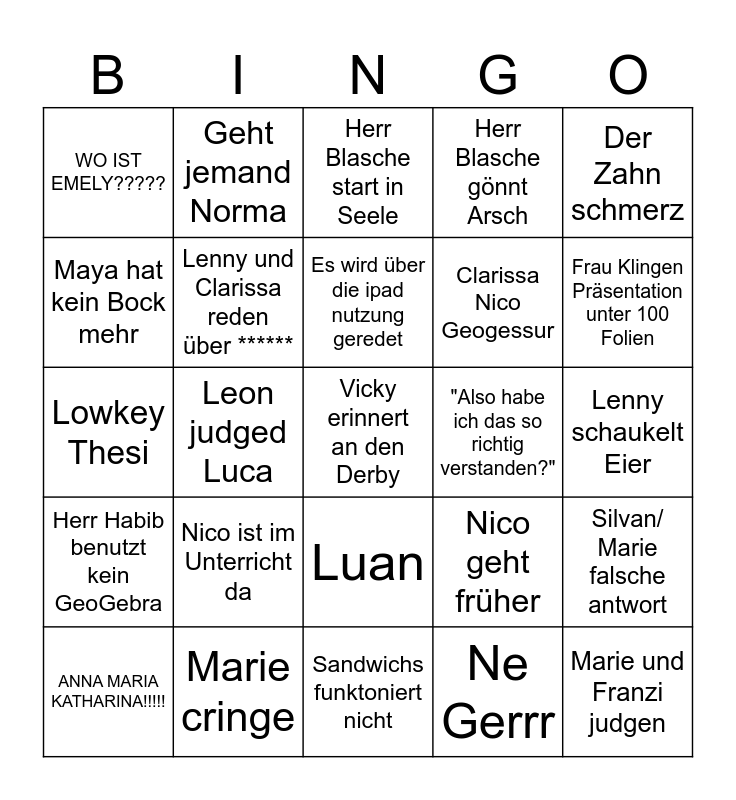 This bingo card has a free space and 24 words: Nico ist im Unterricht da, Marie cringe, Es wird über die ipad nutzung geredet, ANNA MARIA KATHARINA!!!!!, Der Zahn schmerz, WO IST EMELY?????, Maya hat kein Bock mehr, Geht jemand Norma, "Also habe ich das so richtig verstanden?", Luan, Clarissa Nico Geogessur, Lowkey Thesi, Nico geht früher, Silvan/ Marie falsche antwort, Lenny und Clarissa reden über ******, Ne Gerrr, Lenny schaukelt Eier, Herr Blasche start in Seele, Frau Klingen Präsentation unter 100 Folien, Leon judged Luca, Marie und Franzi judgen, Herr Habib benutzt kein GeoGebra, Herr Blasche gönnt Arsch and Sandwichs funktoniert nicht.