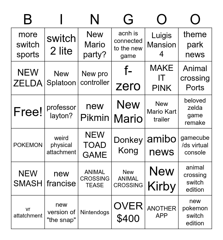 This bingo card has 36 words: New ANIMAL CROSSING, ANIMAL CROSSING TEASE, OVER $400, NEW ZELDA, POKEMON, New Mario, New Splatoon, Nintendogs, Luigis Mansion 4, New Kirby, Animal crossing Ports, acnh is connected to the new game, animal crossing switch edition, professor layton?, f-zero, more switch sports, NEW SMASH, New Mario Kart trailer, Free!, New Mario party?, new Pikmin, weird physical attachment, Donkey Kong, NEW TOAD GAME, amibo news, switch 2 lite, MAKE IT PINK, new version of "the snap", New pro controller, theme park news, new pokemon switch edition, vr attatchment, gamecube /ds virtual console, beloved zelda game remake, new francise and ANOTHER APP.
