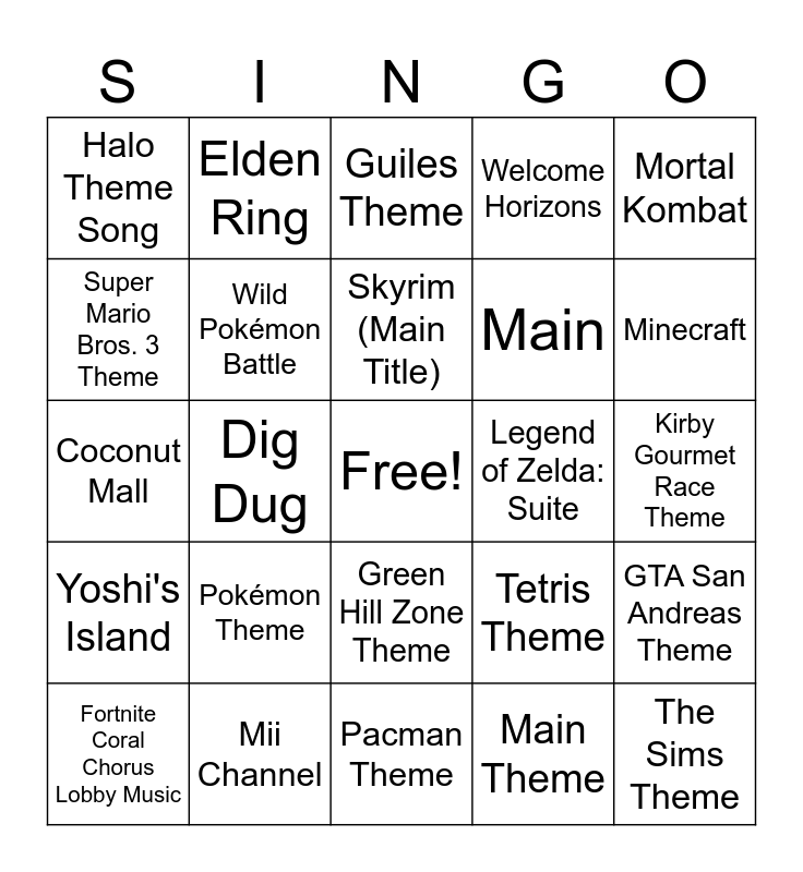 This bingo card has a free space and 24 words: Pokémon Theme, Mii Channel, Skyrim (Main Title), Fortnite Coral Chorus Lobby Music, Mortal Kombat, Halo Theme Song, Super Mario Bros. 3 Theme, Elden Ring, Legend of Zelda: Suite, Green Hill Zone Theme, Main, Coconut Mall, Tetris Theme, GTA San Andreas Theme, Wild Pokémon Battle, Main Theme, Kirby Gourmet Race Theme, Guiles Theme, Minecraft, Dig Dug, The Sims Theme, Yoshi's Island, Welcome Horizons and Pacman Theme.