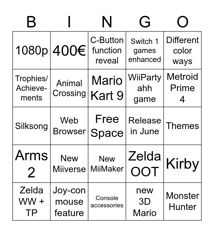 This bingo card has a free space and 24 words: New Miiverse, Joy-con mouse feature, Mario Kart 9, Zelda WW + TP, Different color ways, 1080p, Trophies/ Achieve- ments, 400€, Release in June, New MiiMaker, WiiParty ahh game, Silksong, Zelda OOT, Kirby, Animal Crossing, new 3D Mario, Themes, C-Button function reveal, Metroid Prime 4, Web Browser, Monster Hunter, Arms 2, Switch 1 games enhanced and Console accessories.