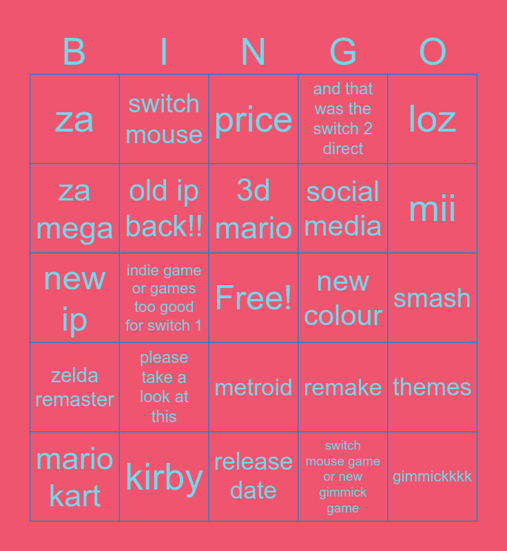 This bingo card has a free space and 24 words: please take a look at this, kirby, 3d mario, mario kart, loz, za, za mega, switch mouse, new colour, metroid, social media, new ip, remake, themes, old ip back!!, switch mouse game or new gimmick game, smash, price, mii, indie game or games too good for switch 1, gimmickkkk, zelda remaster, and that was the switch 2 direct and release date.