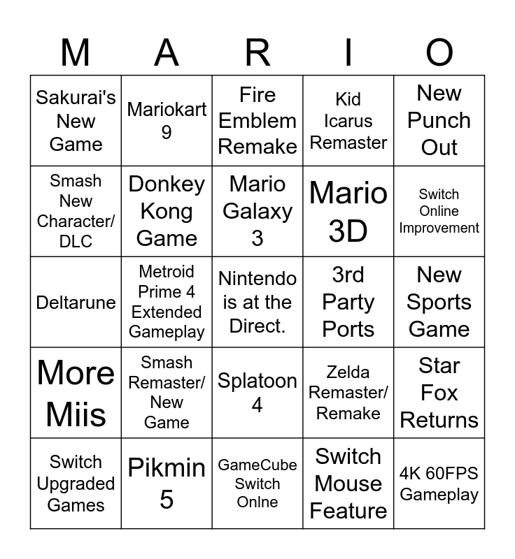 This bingo card has a free space and 24 words: Smash Remaster/ New Game, Pikmin 5, Mario Galaxy 3, Switch Upgraded Games, New Punch Out, Sakurai's New Game, Smash New Character/ DLC, Mariokart 9, 3rd Party Ports, Splatoon 4, Mario 3D, Deltarune, Zelda Remaster/ Remake, Star Fox Returns, Donkey Kong Game, Switch Mouse Feature, New Sports Game, Fire Emblem Remake, Switch Online Improvement, Metroid Prime 4 Extended Gameplay, 4K 60FPS Gameplay, More Miis, Kid Icarus Remaster and GameCube Switch Onlne.