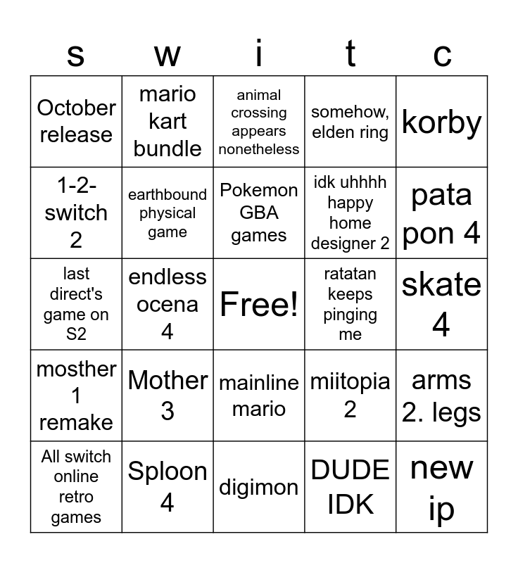 This bingo card has a free space and 24 words: Mother 3, Sploon 4, Pokemon GBA games, All switch online retro games, korby, October release, 1-2-switch 2, mario kart bundle, ratatan keeps pinging me, mainline mario, idk uhhhh happy home designer 2, last direct's game on S2, miitopia 2, arms 2. legs, earthbound physical game, DUDE IDK, skate 4, animal crossing appears nonetheless, pata pon 4, endless ocena 4, new ip, mosther 1 remake, somehow, elden ring and digimon.