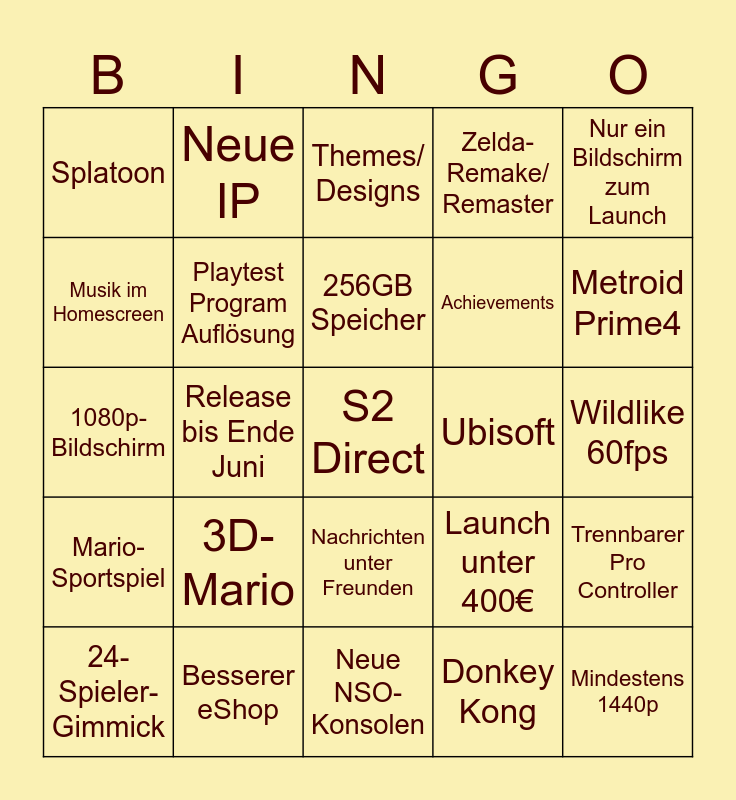 This bingo card has a free space and 24 words: 24-Spieler-Gimmick, 3D-Mario, 256GB Speicher, Donkey Kong, Nur ein Bildschirm zum Launch, Splatoon, Neue IP, Themes/ Designs, Ubisoft, Wildlike 60fps, 1080p-Bildschirm, Playtest Program Auflösung, Launch unter 400€, Trennbarer Pro Controller, Musik im Homescreen, Besserer eShop, Neue NSO-Konsolen, Zelda-Remake/ Remaster, Metroid Prime4, Mario-Sportspiel, Release bis Ende Juni, Nachrichten unter Freunden, Achievements and Mindestens 1440p.